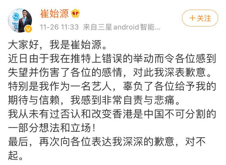道歉信中,崔始源称自己只是抱着希望早日止暴止乱的想法,而这封信也只发布在微博上。