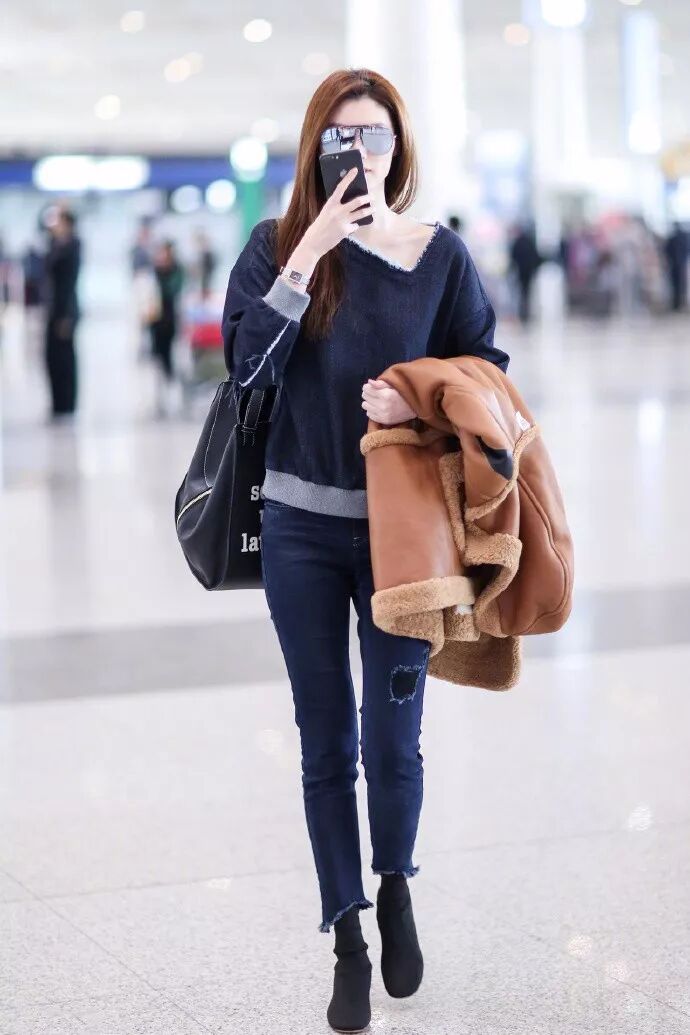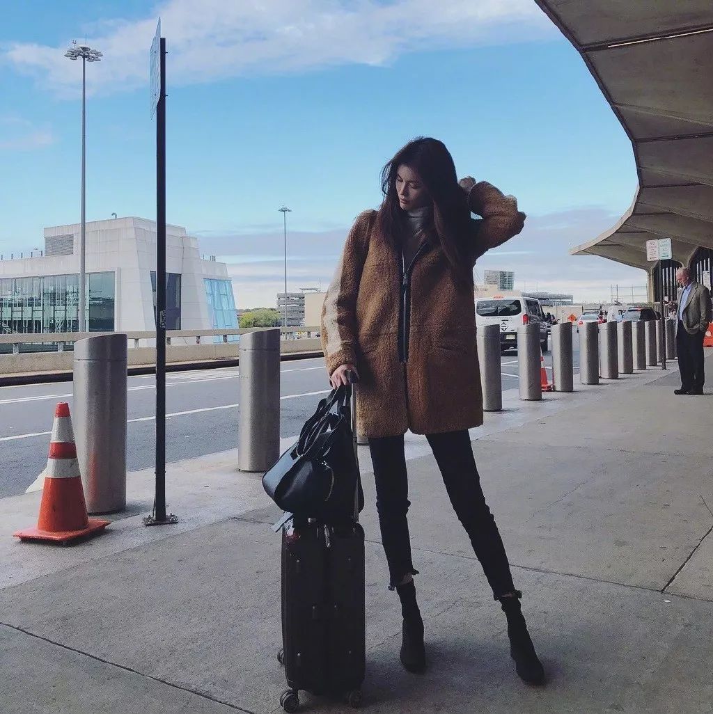 同样是机场look,何穗这次选择焦糖色羊羔毛外套,下搭碎边的九分裤,脚踩一双黑色短靴。又保暖又时髦。▼