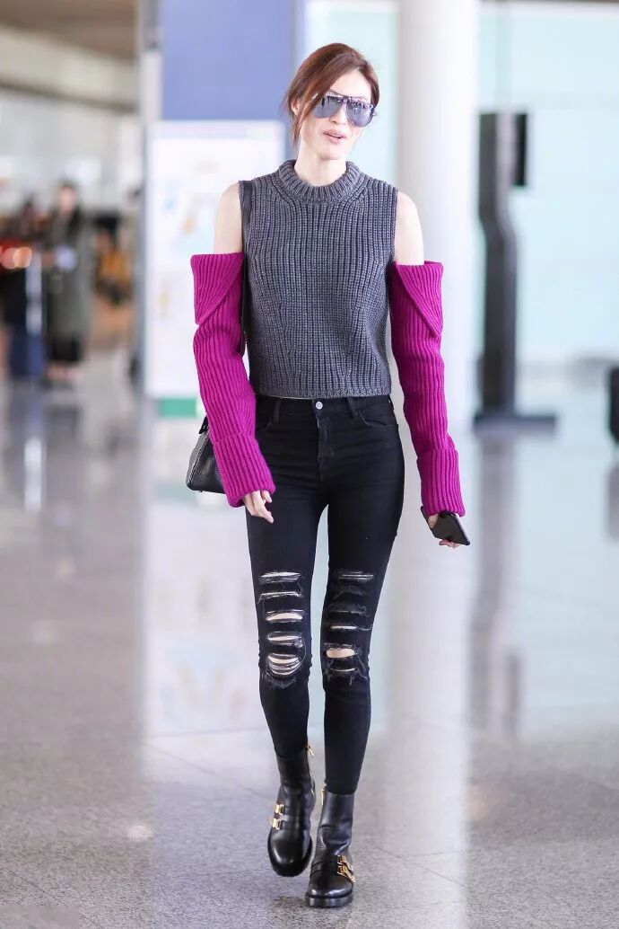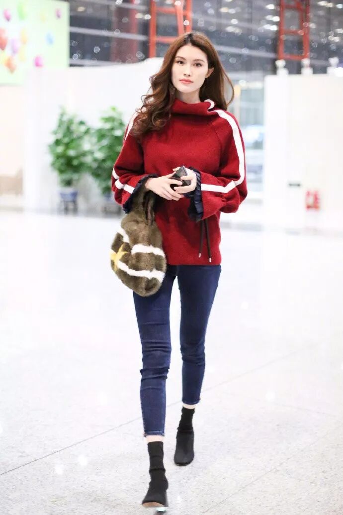 与张俪在机场偶遇的何仙姑,穿一件酒红色羊羔绒短上衣,下搭黑色紧身裤与黑色长靴,秀出自己一双大长腿。这身打扮去赶飞机也非常舒服。▼