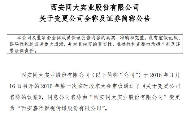 2016年3月16日,西安同大正式更名为嘉行传媒。