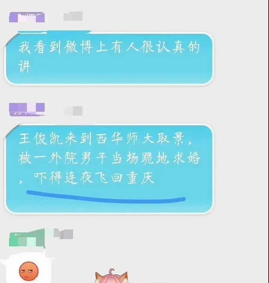 还信誓旦旦地讲,王俊凯来到西华师大取景,被一外院男子当场跪地求婚,吓得连夜飞回重庆。
