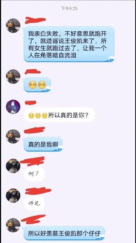 “我表白失败,不好意思就跑开了,就造谣说王俊凯来了,所有女生就跑过去了,让我一个人在角落暗自流泪。”