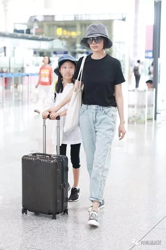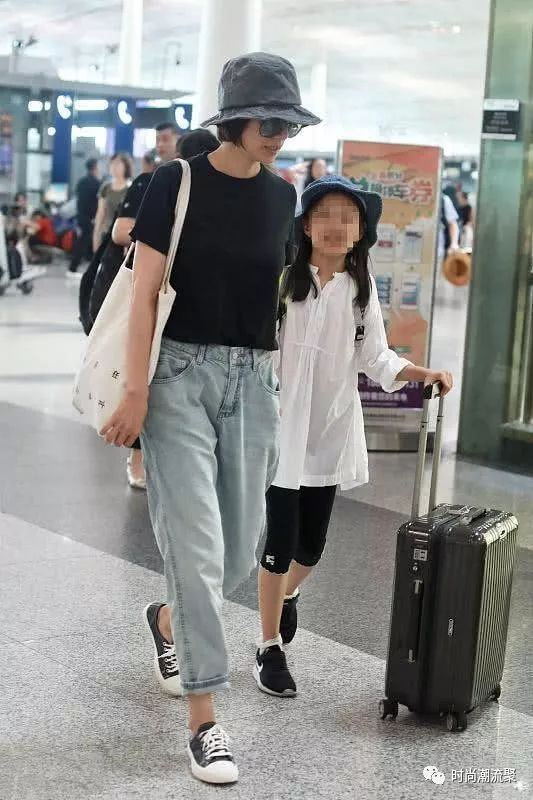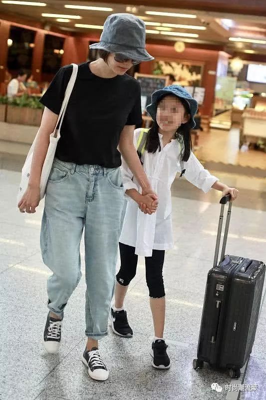 和夏雨一样,袁泉也穿了件黑色的短袖T恤,但是呢,她用一条浅蓝色的卷边牛仔裤来打破了沉闷感,再搭配上一双帆布鞋,看起来的话还是颇为小清新的呢。看着哪像是一个42岁的人啊。妈妈打扮得这么好看,女儿的气质也不差。