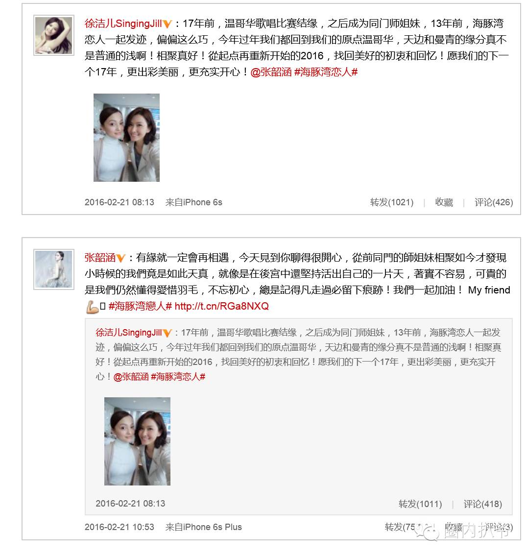 张韶涵和徐洁儿在偶像剧《海豚湾恋人》中分别饰演易天边和沈曼青。很多小婊贝对《海豚湾恋人》依旧恋恋不忘,声称“哇塞,多少年都没有碰到了,曼青和小瓶盖重聚首。”“那一会不知道把海豚湾恋人看了多少遍。”“当时海豚湾恋人里面的三个女的都超级喜欢,好有气质的说。”