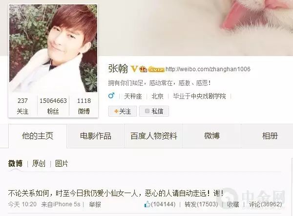 2014年2月,张翰发布微博,”现在我终于相信和你步入婚礼的不一定是你最爱的人“,随后秒删,引发网友猜测。