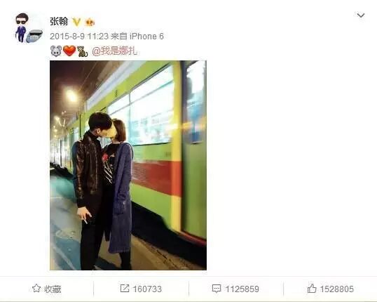 15年8月,张翰在微博晒出与娜扎的甜蜜拥吻照,并配文”老鼠“爱”猴子“,宣布与娜扎的恋情。