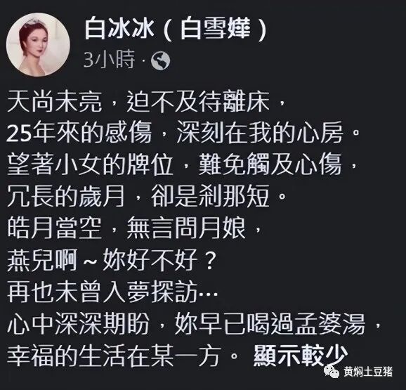 近日,台语歌后白冰冰在社交帐号发文悼念已逝25年的女儿白晓燕,言辞间满是想念和祝福,令人动容。