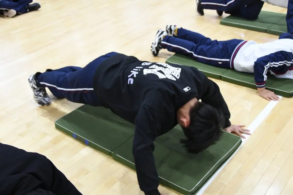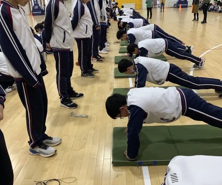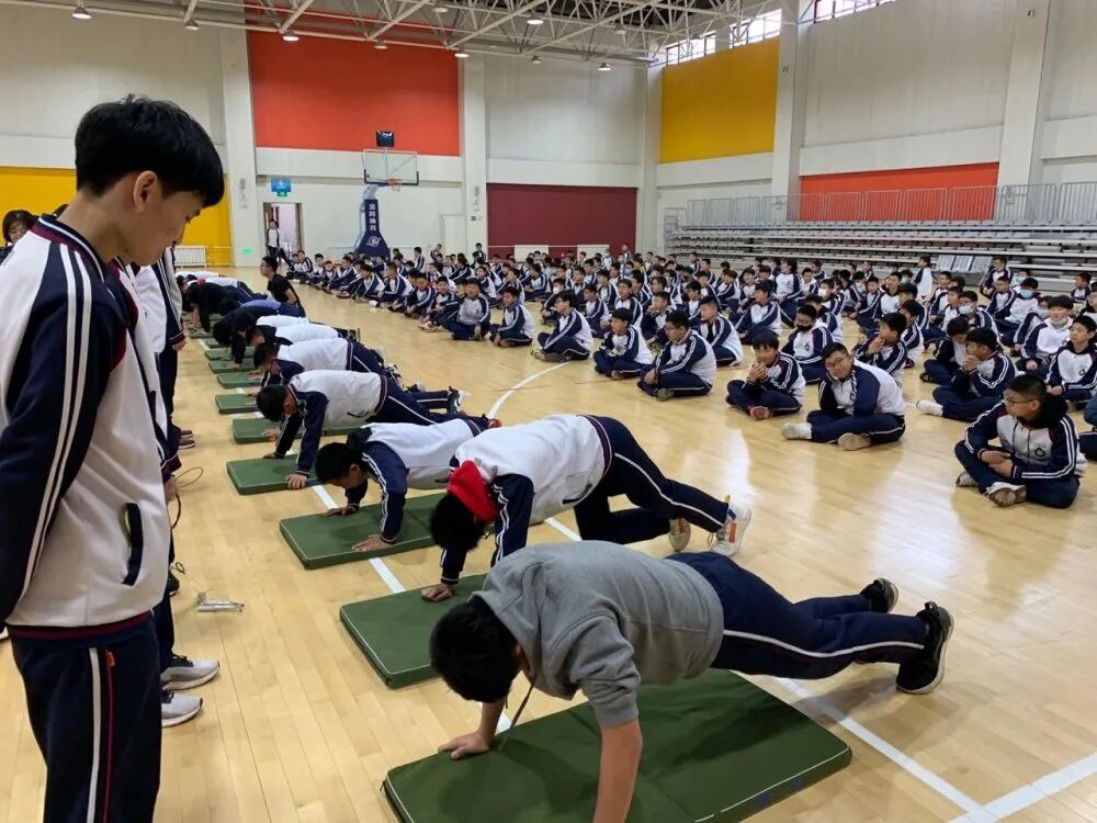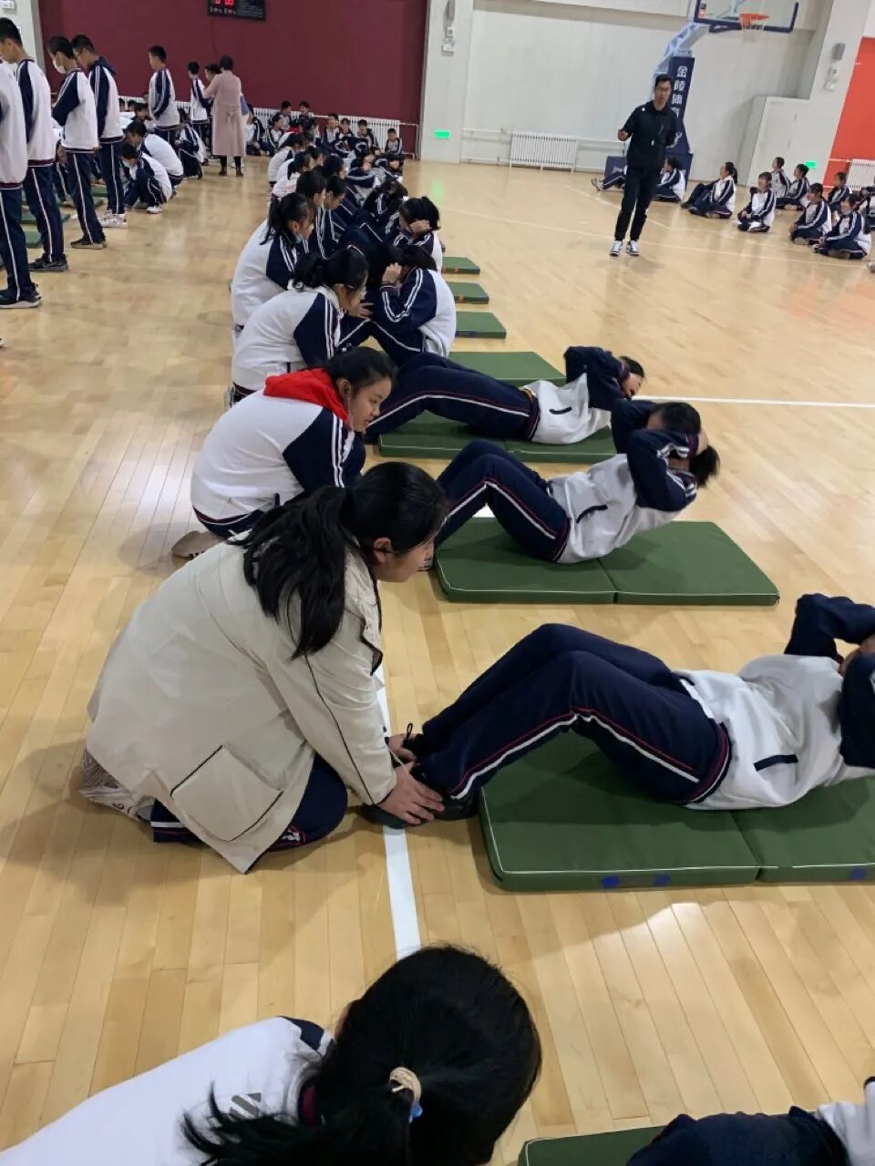 全班学生齐参与!男生俯卧撑,女生仰卧起坐。相互鼓励、相互促进,各显神通,为班级集体荣誉而奋战!