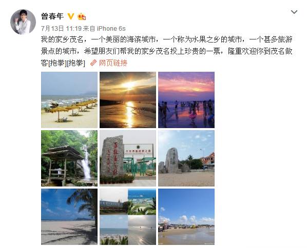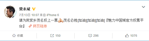昨天上午,茂名人的明星也站出来为家乡助阵了,梁永斌、弦子、曾春年等明星分别在各自的微博及微信发出了为家乡茂名投票的呼吁。