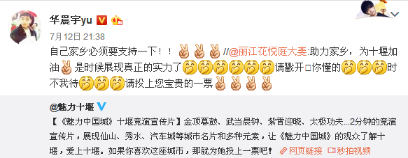 “魅力中国城”竞演,让茂名、十堰两座城市展开了一场全民拉票PK大赛,两座城市的市民们纷纷拿出手机,为自己的家乡投票助力。前日,在票数落后于茂名几万票的时候,十堰搬出了明星华晨宇为家乡拉票,一夜之间,票数迅速飙升上来,并赶超茂名。