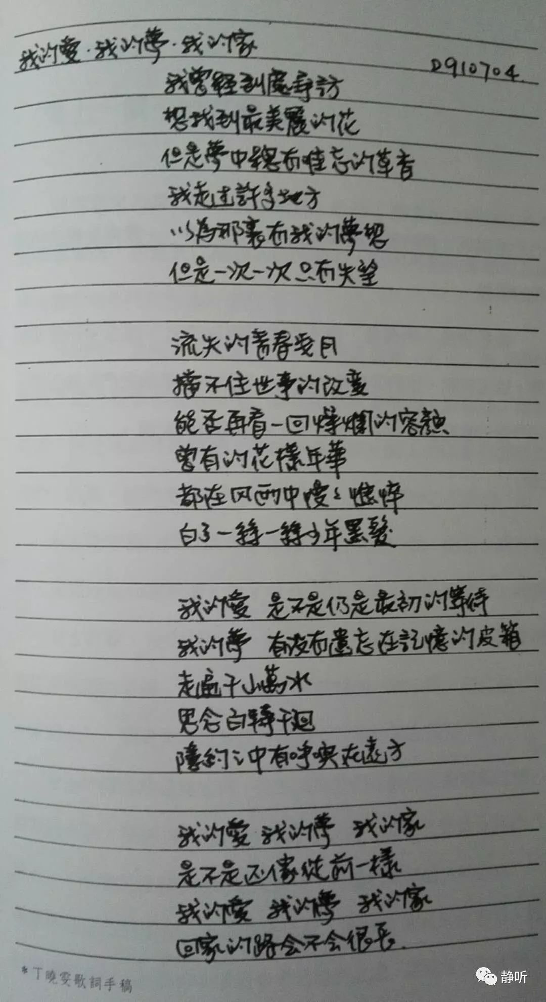 丁晓雯《我的爱·我的梦·我的家》歌词手稿