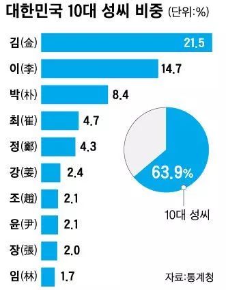据2018年统计,韩国金姓占了总人口的21.59%,李姓占了总人口的14.78%,朴姓占了总人口的8.47%,崔姓占了总人口的4.72%。