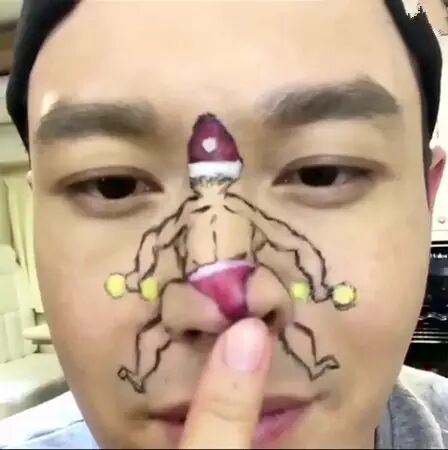 把三点式圣诞老人画到脸上,用手指点鼻子