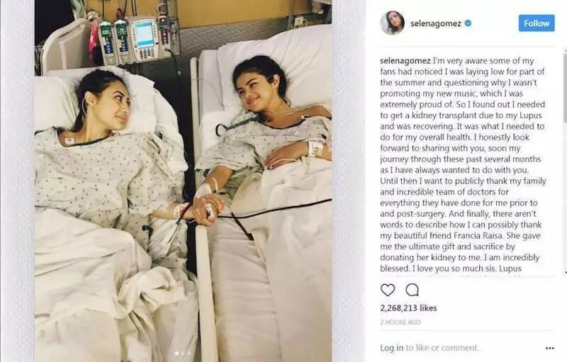 人气女星 Selena Gomez 早在2015年就公布自己患有 Lupus(红斑性狼疮),从那之后就一直在接受医学治疗。近期,Selena Gomez 在 Instagram 上自爆已经接受肾移植手术,还将自己与捐赠者躺在病床上手拉手的照片放在了社交媒体。