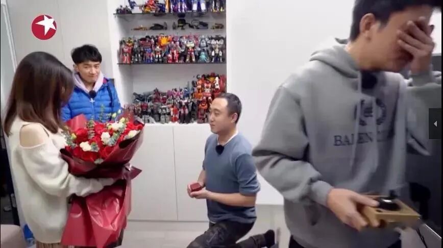 这对素人恋人在家里当着王祖蓝和贾乃亮的面,进行了求婚仪式,当贾乃亮看到男主人向相恋已久的女友求婚的场景,顿时就情绪失控。