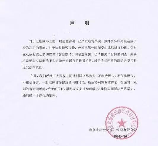 最近都在疯传李易峰插足杨幂和刘恺威的婚礼导致两人离婚。面对这么恶意的诽谤李易峰公司在今日发布一份声明,称已经向造谣者发律师函将采取法律的手段向造谣者追究法律责任。
