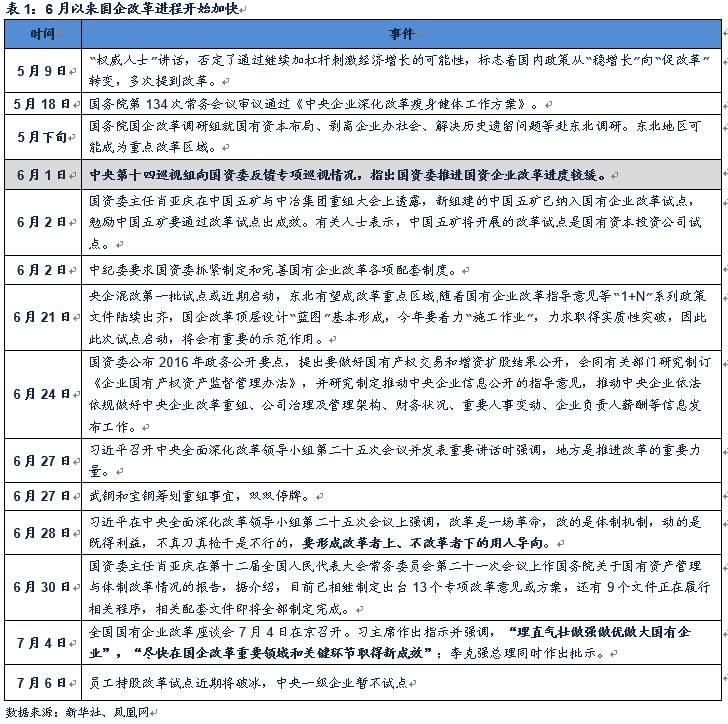 2、近期各个层面官方声音都在要求和督促央企加快改革,甚至巡视组在六月初点名国资委的央企层面改革进展太慢;