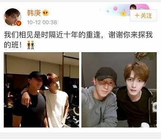 然后在今天凌晨的时候,韩庚就晒了他和金在中的合影,我们相见是时隔近十年的重逢…………