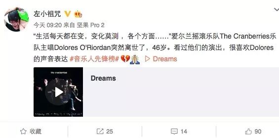 在微博上看到左小祖咒发文悼念Dolores,“生活每天都在变,变化莫测,各个方面……看过他们的演出,很喜欢Dolores的声音表达”,并以一个伤心的表情作为结束。