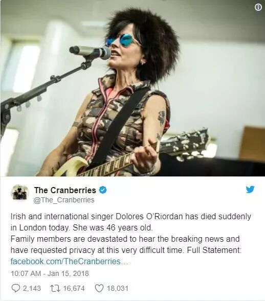 (Dolores O'Riordan)在伦敦的一家酒店里去世,年仅46岁,死因暂未公布。