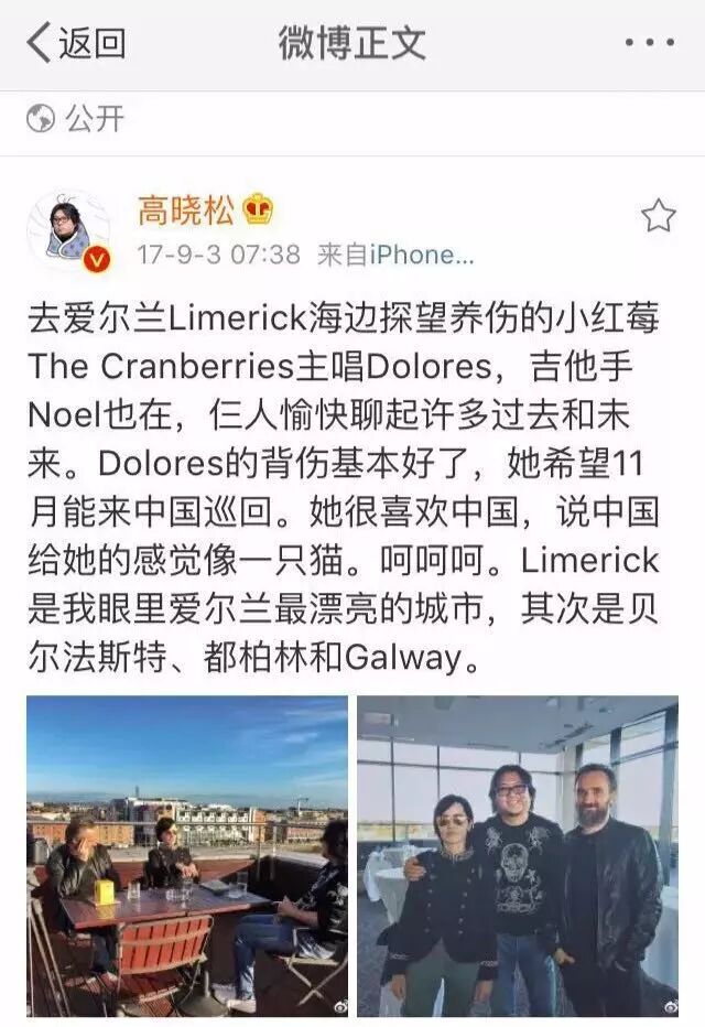 高晓松去年曾去探访过O'Riordan,谈及她很希望来中国巡回,并笑称中国给她的感觉像一只猫。《晓说》也长期用《Zombie》做片头曲,今天高晓松连发两条微博悼念。