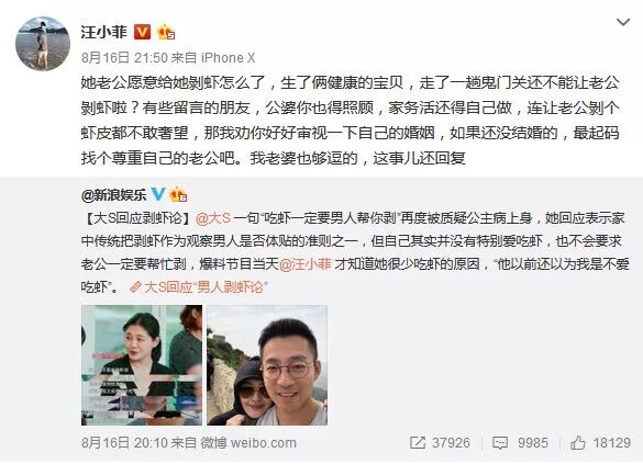 “剥虾论”一出,许多人质疑大S有公主病,他立马上微博上实力护妻,“她老公愿意给她剝虾怎么了,生了俩健康的宝贝,走了一趟鬼门关还不能让老公剝虾啦?”