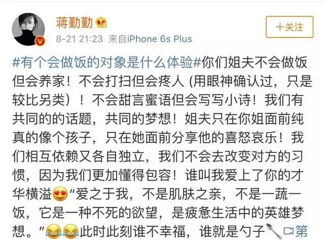 柴米油盐酱醋茶,神仙眷侣也蹉跎,任何婚姻底色都是一样的,无论你多么完美顺意,都不可能永远和喜欢的人,在喜欢的地方,做着喜欢做的事。所以,走过十数年婚姻的蒋勤勤才会说:“两个人在经历过争吵、摩擦、不开心后,能始终在一起、持续在一起,这就是幸福。”