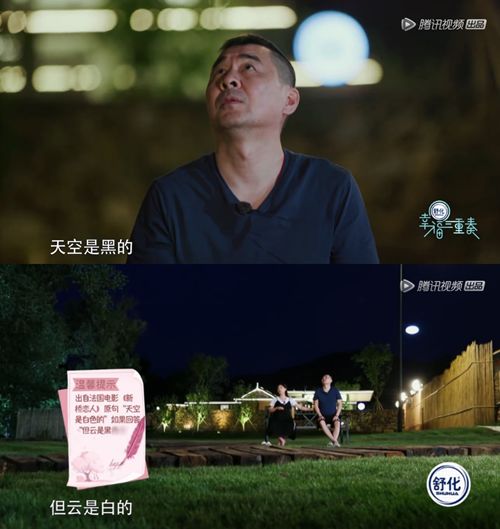 夜晚散步,陈建斌望着天空,说了一句“天空是黑的。”蒋勤勤立刻接道:“但云是白的!”