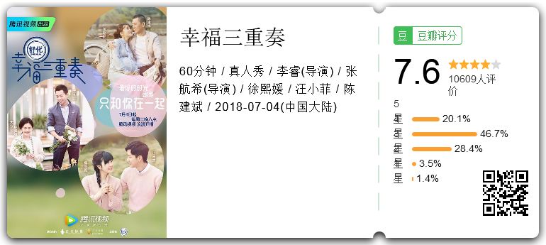 节目邀请了三组真实明星夫妻前往远离都市的专属小屋,跟拍他们褪去光环后的普通婚姻生活,目前豆瓣上1万人给出了7.6的平均分,在国产综艺里,算较高水准。