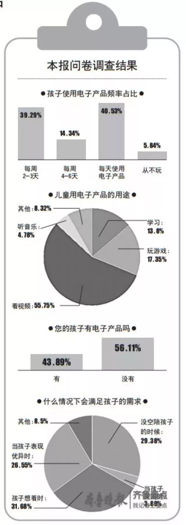 根据调查结果,31.68%家长选择在孩子想看时满足他使用电子产品的需求;29.38%在没空陪孩子的时候会允许孩子使用电子产品;26.55%的家长在孩子表现优异时会满足他使用电子产品的需求。