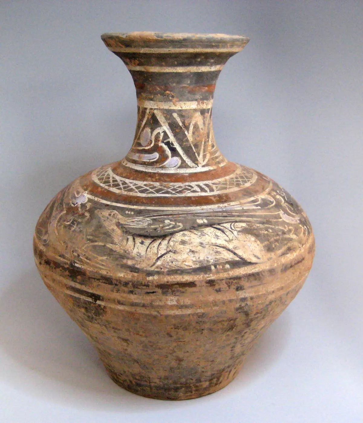 汉代陶器的装饰,一般陶器有弦纹、划纹、绳纹、印纹、模印浮雕、涂色和彩绘等若干种。有的弦纹比较宽,形似瓦沟状,故又称“瓦纹”,划纹有平行直线纹、连续点状纹,这种纹样像断线的珍珠,还有三角纹、连环纹、栉齿纹和阴刻动物纹,如虎、雀等。