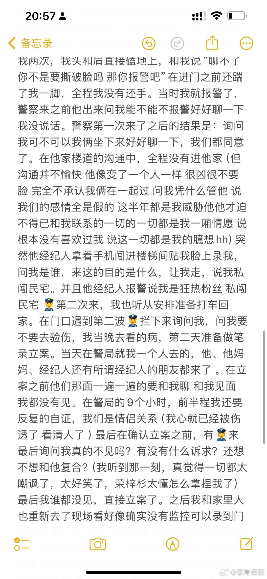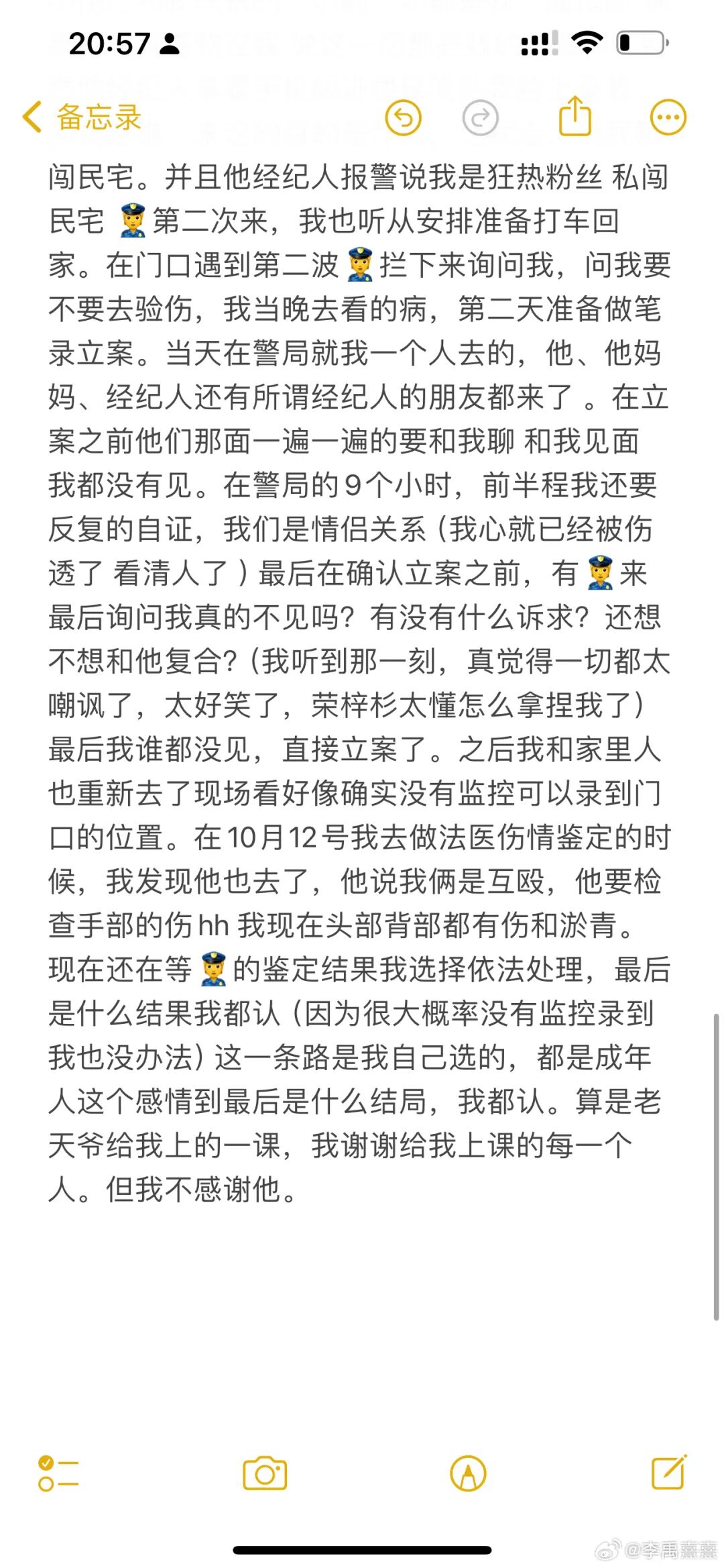 随后,双方均向警方报案——李禹熹控诉殴打,荣梓杉方则反诉其“骚扰跟踪”。值得注意的是,警方初步否认了工作室关于“私闯民宅”的说法。