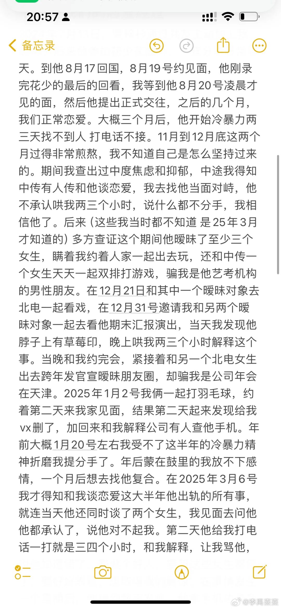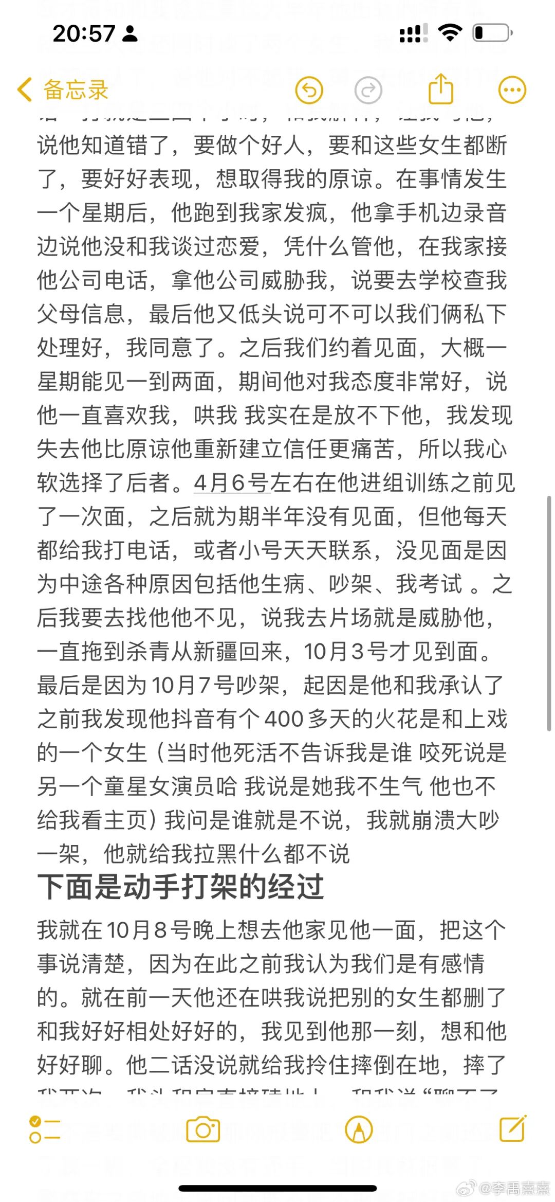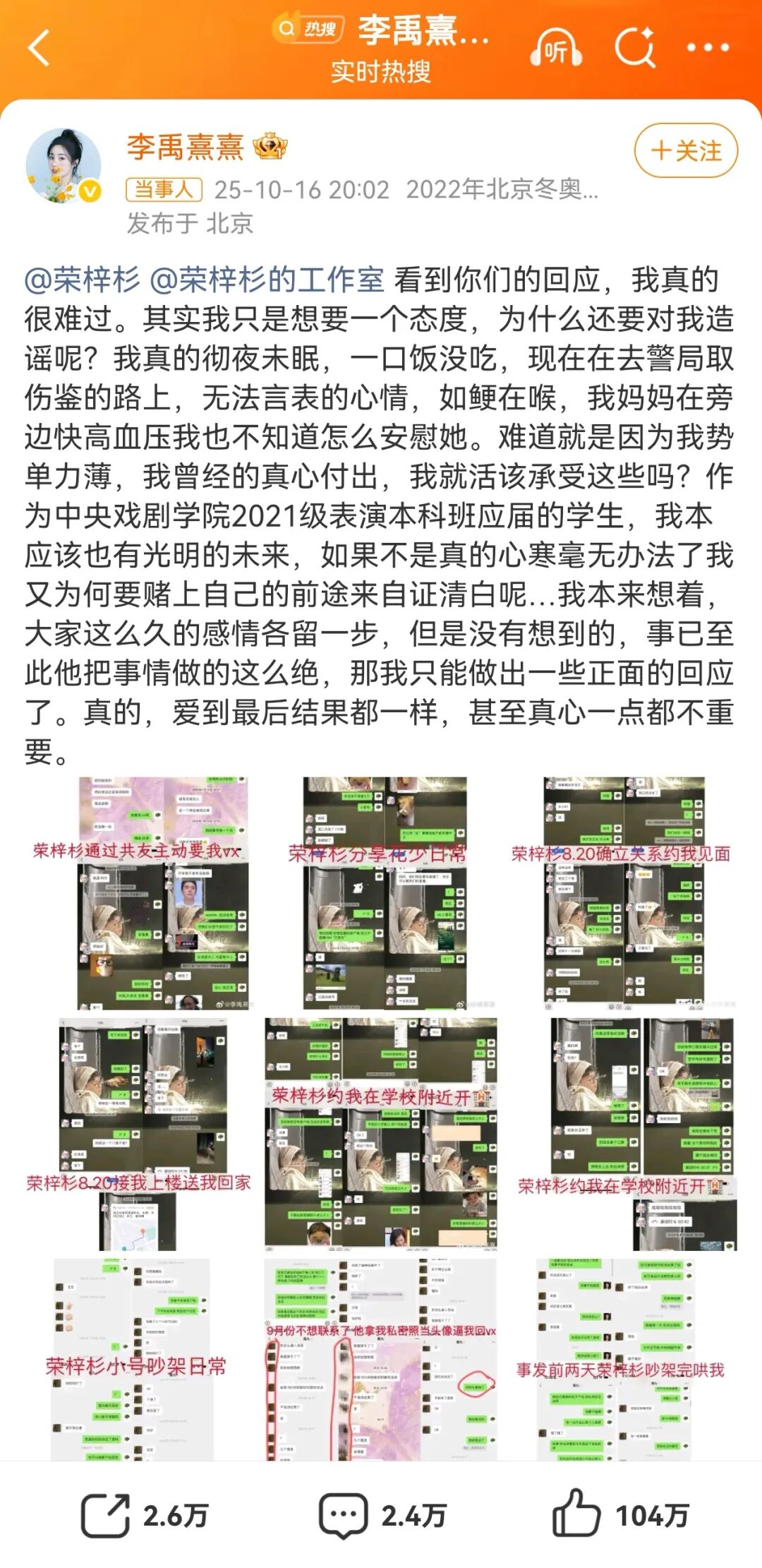 这场风波的起点,是李禹熹于2025年10月15日起在社交媒体上的连续发文。她以大量聊天记录、转账截图和伤情鉴定,描绘了一段从亲密到破裂的情感关系。