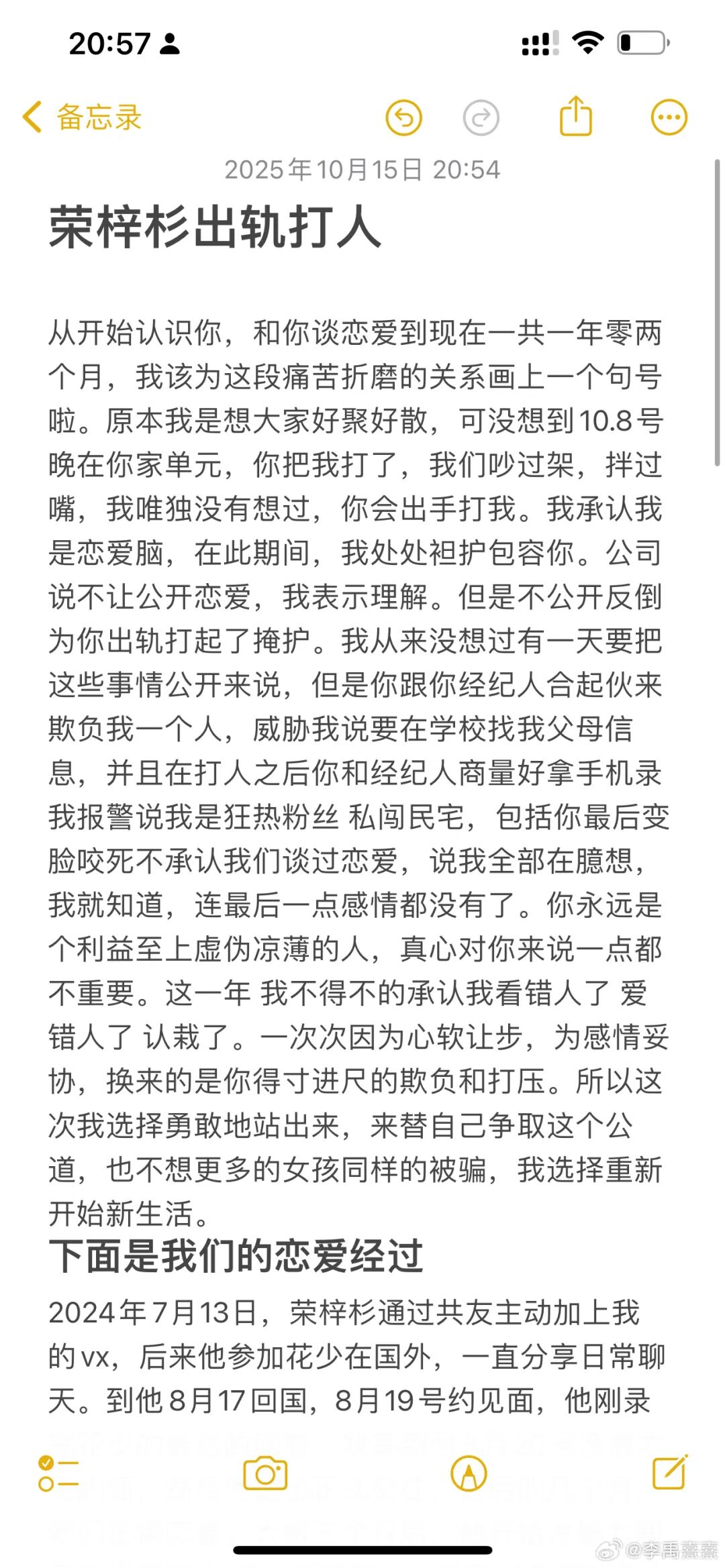 事件在2025年10月8日升级。李禹熹称因情感纠纷前往荣梓杉住处后,遭其“拎摔、踹踢”,并出示了“头部挫伤+肩锁关节错位”的伤情鉴定书及报警回执。
