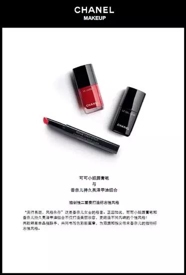 “流行易逝,风格永存”这是香奈儿女士的格言。正因如此,可可小姐唇膏笔和香奈儿持久亮泽甲油组合不仅能给你打造美丽妆容,更能缔造不同凡响的个性风格!
