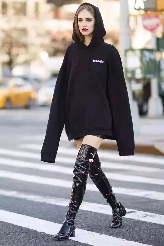 春天穿长款卫衣搭配过膝长靴特别好看~▼