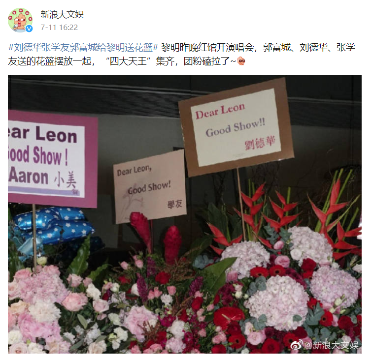 “活久见”加“爷青回”的意思是,黎明开演唱会,刘德华、张学友、郭富城都给他送花篮,四大天王的花篮摆在一起,四舍五入也算隔空重聚了。