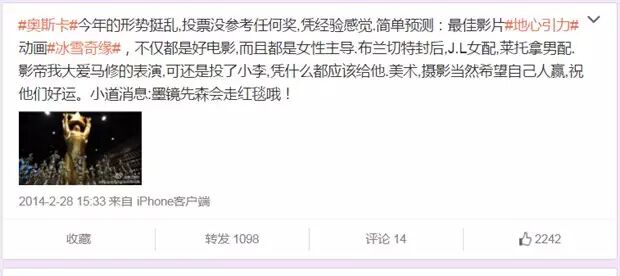 她写道:伴随多年“小李专注陪跑奥斯卡”的话题估摸着今年会是一个结点,全世界的观众都知道他对得起“演员”这一称谓!无论结果如何,奥斯卡的最佳男主角也远远不会是他的终点!