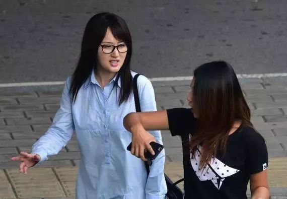 被抓拍到的她,身穿蓝色的衬衫,戴着一副黑框眼镜,斜刘海直长发,素颜状态下的她也不错!