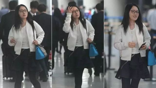 白色的T恤+外套+黑色蛋糕短裙+黑色的打底,侧分直长发,戴着眼镜甜笑的她舒适迷人,这样有活力的她哪里像是46岁的人啊!