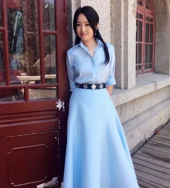 一件天蓝色的长裙,腰间的腰带设计衬的身材更加的高挑,侧分半扎发,对镜甜笑的她清新温婉,优雅动人!