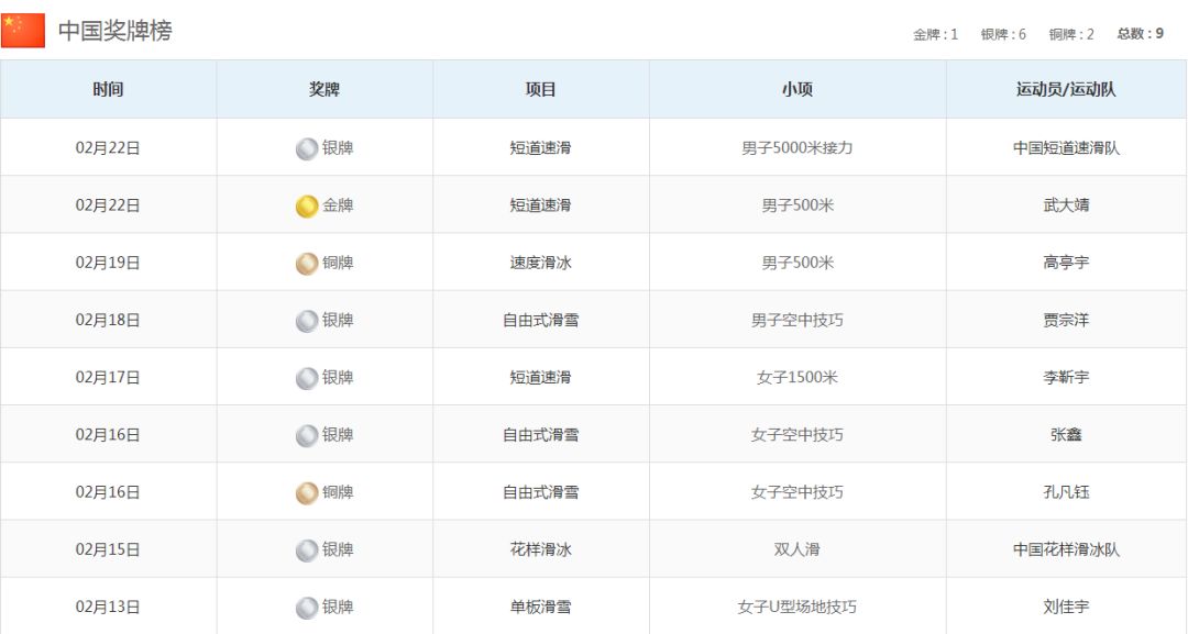 截止2018年2月25日14:00,中国在平昌冬奥会共取得1金6银2铜九枚奖牌。