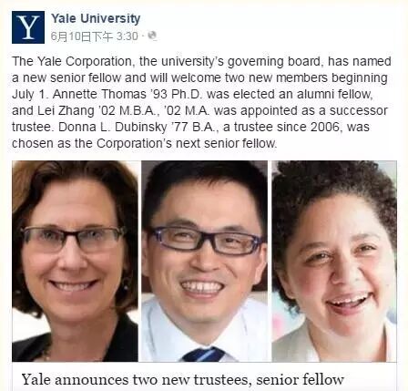 据耶鲁大学官方消息,6月9日,耶鲁大学校长Peter Salovey宣布,张磊将接替前美国麻省最高法院首席大法官玛格丽特·H·马歇尔女士,成为耶鲁大学新任校董。“张磊先生身上集中体现了耶鲁一直寻求的全球领导力”,Salovey校长说,“他的远见卓识对推动耶鲁的国际化和国际交流与合作至关重要,张磊先生此次成为新任校董,将使他自己和耶鲁大学都在不断追求卓越的道路上更进一步。”