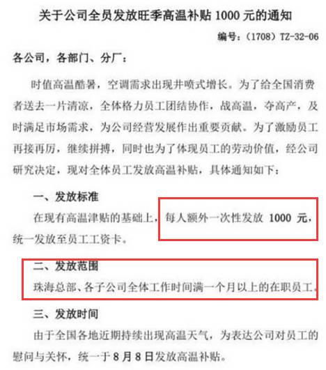 昨天,格力发布全员公告,给每位员工发1000元高温补贴,只要是工作满一个月的都发。而去年11月,格力还给7万员工每人每月加薪1000元。
