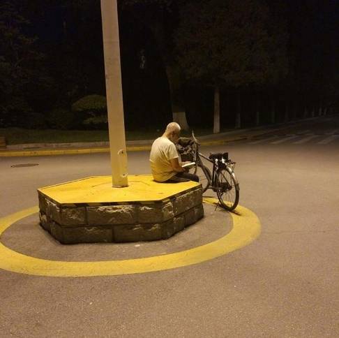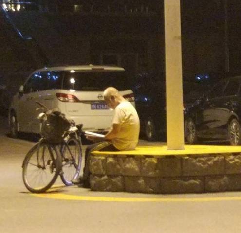 北师大科技楼前,入夜,老爷爷独自一人在路灯下安安静静的读书。(安醇淡_)