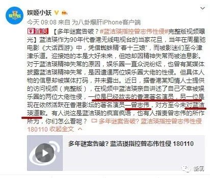今天曾志伟、蓝洁瑛双双飘在热搜上,揭露出一个香港娱乐圈惊天大谜案—当年性侵蓝洁瑛的2个大佬双双被曝光。