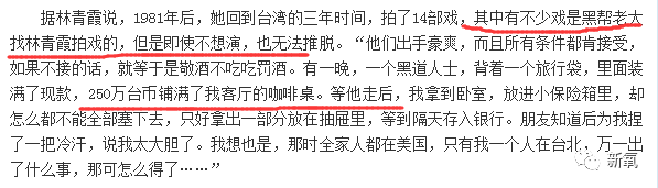 她在报纸专栏里写过被黑社会强迫拍戏的经历,250万台币铺满客厅的咖啡桌。