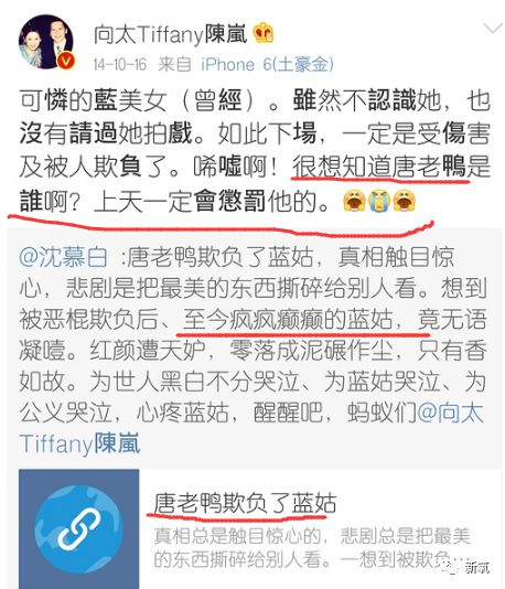 2014年时向太曾转发过一条微博,说是蓝姑被唐老鸭欺负了,而那个唐老鸭到底是谁?现在好像不言而喻了。