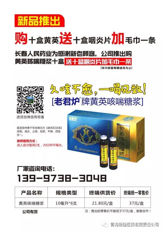 青海新隆医药有限责任公司携手长春人民药业集团有限公司为答谢新老客户,特推出新品老君炉牌【黄英咳喘糖浆】活动开始啦!