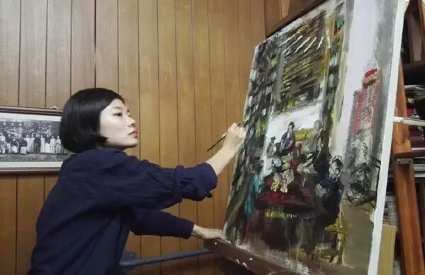 活动中,青年艺术家张晓彤进行油画速写,用画笔全程记录深夜书房的景象。海河边青灰色的民国空间里,还有一群夜聊人在分享故事。